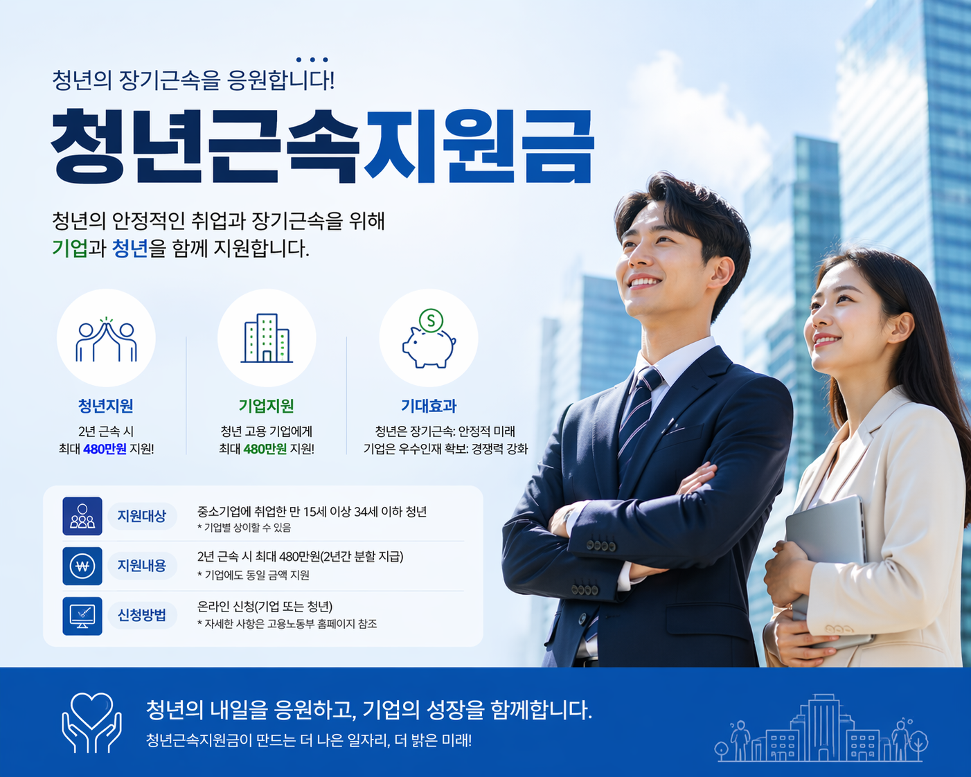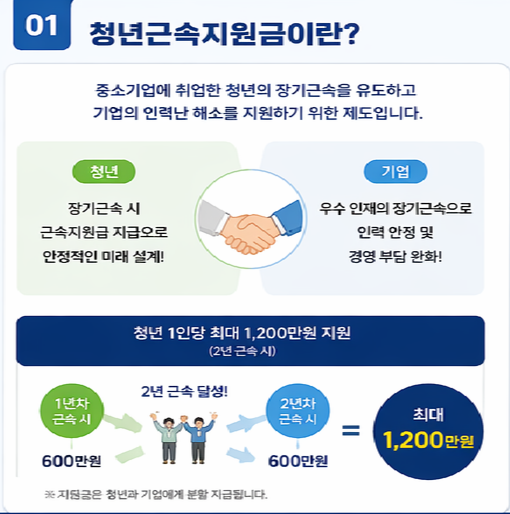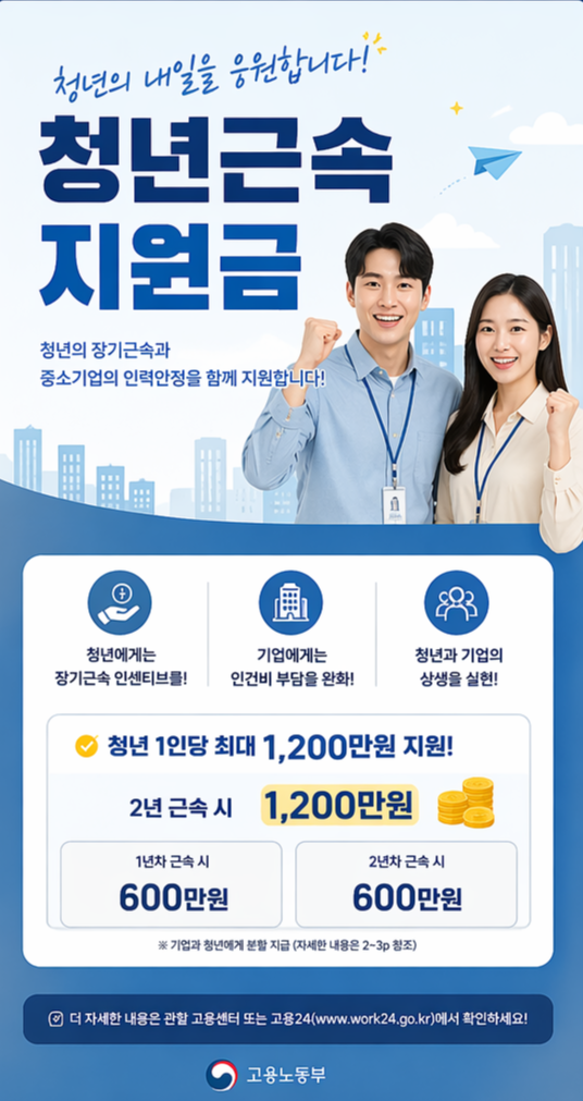 청년근속지원금은 중소기업 및 중견기업에 취업한 청년이 일정 기간 이상 근무할 경우 정부와 기업이 함께 목돈을 만들어주는 제도입니다. 단순한 지원금이 아니라 “근속 조건을 충족해야 지급되는 자산 형성형 정책”이라는 점이 핵심입니다.