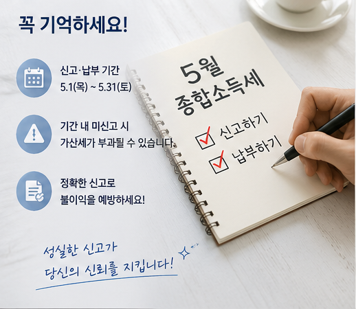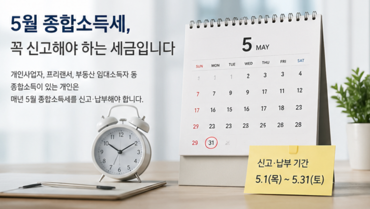 5월 종합소득세 기간·대상·절차·절세전략 총정리 “5월 안 하면 벌금 냅니다”2026년 기준 종합소득세 신고기간, 대상, 신고 방법, 세율 구조, 절세 전략, 실수 방지 포인트까지 실무적으로 바로