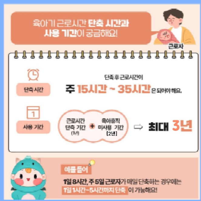 - 만 12세 이하 또는 초등학교 6학년 이하의 자녀를 양육하기 위하여 신청하는 경우 1년간(육아휴직 미사용 기간 2배 가산 시 최대 3년간) 주당 15~35시간으로 근로시간 단축 가능