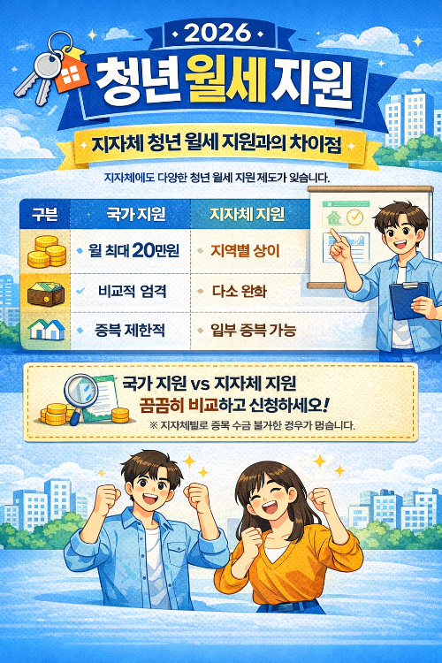 국가 청년 월세 지원 외에도 서울시, 경기도, 부산시 등 지자체별 청년 월세 지원 제도가 별도로 운영되고 있습니다.