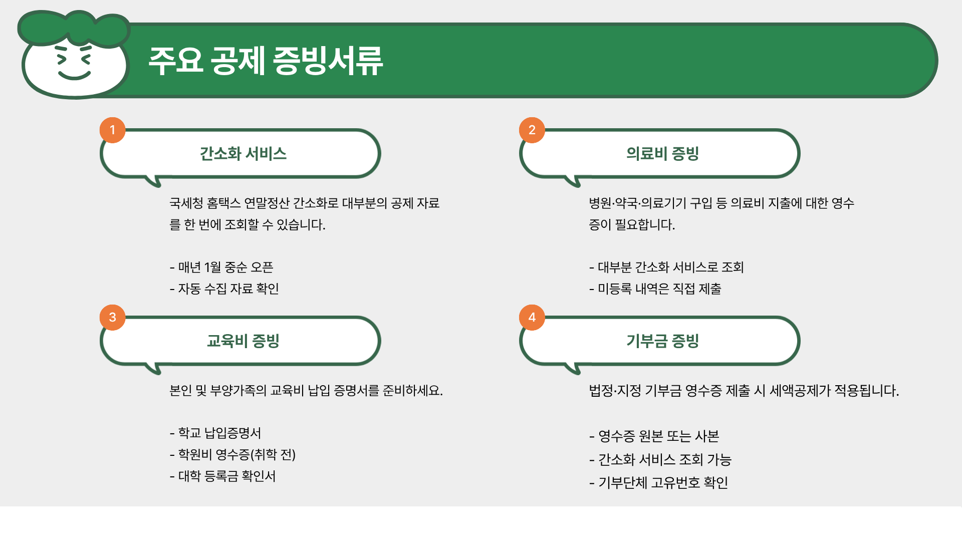 - 의료비·교육비는 자동 반영되지 않는 항목이 있을 수 있으므로 간소화 자료 외 영수증을 꼭 확인하셔야 합니다.