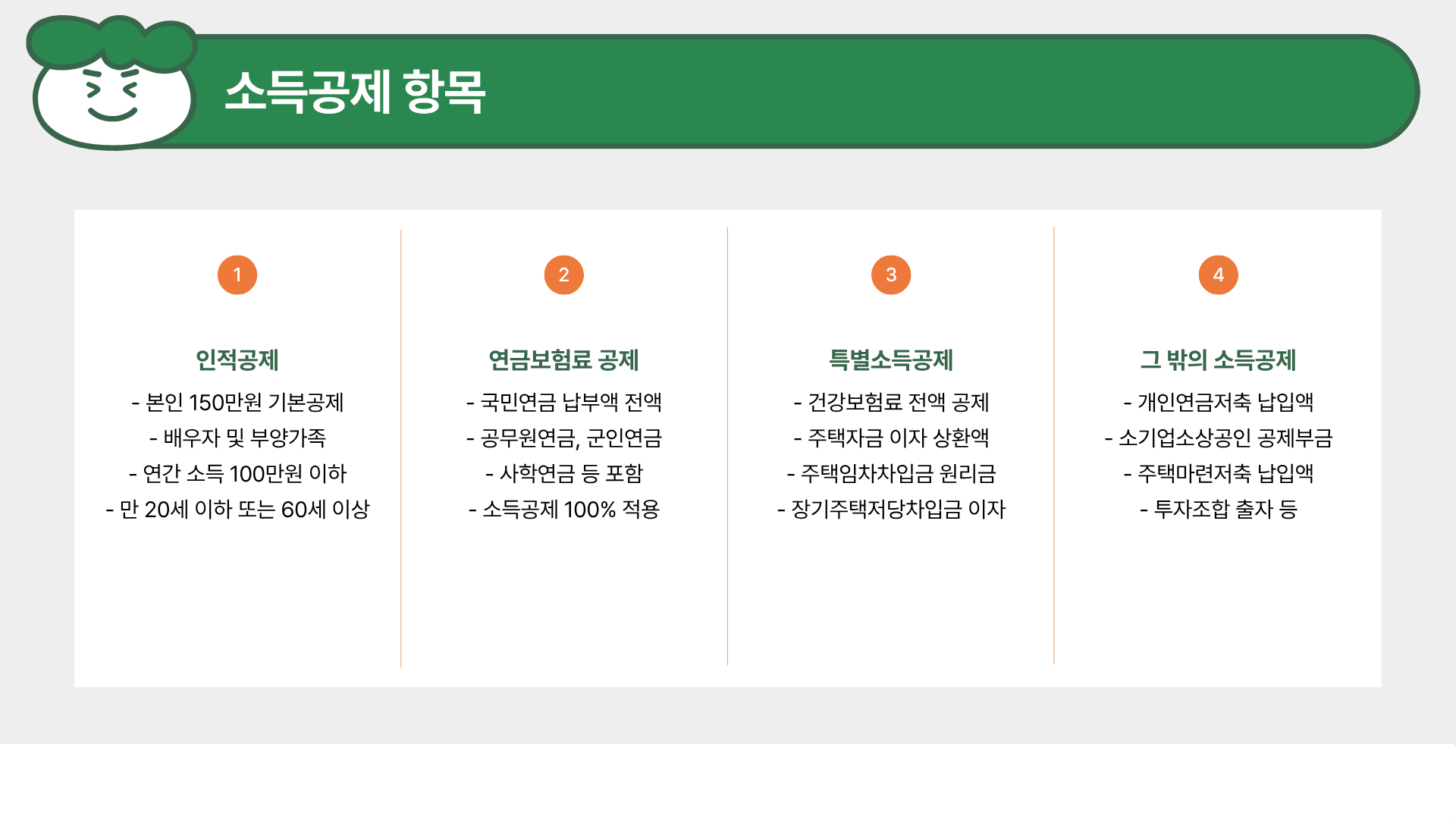 소득공제는 세금을 계산하기 전, 과세 대상 소득을 줄여주는 제도입니다.