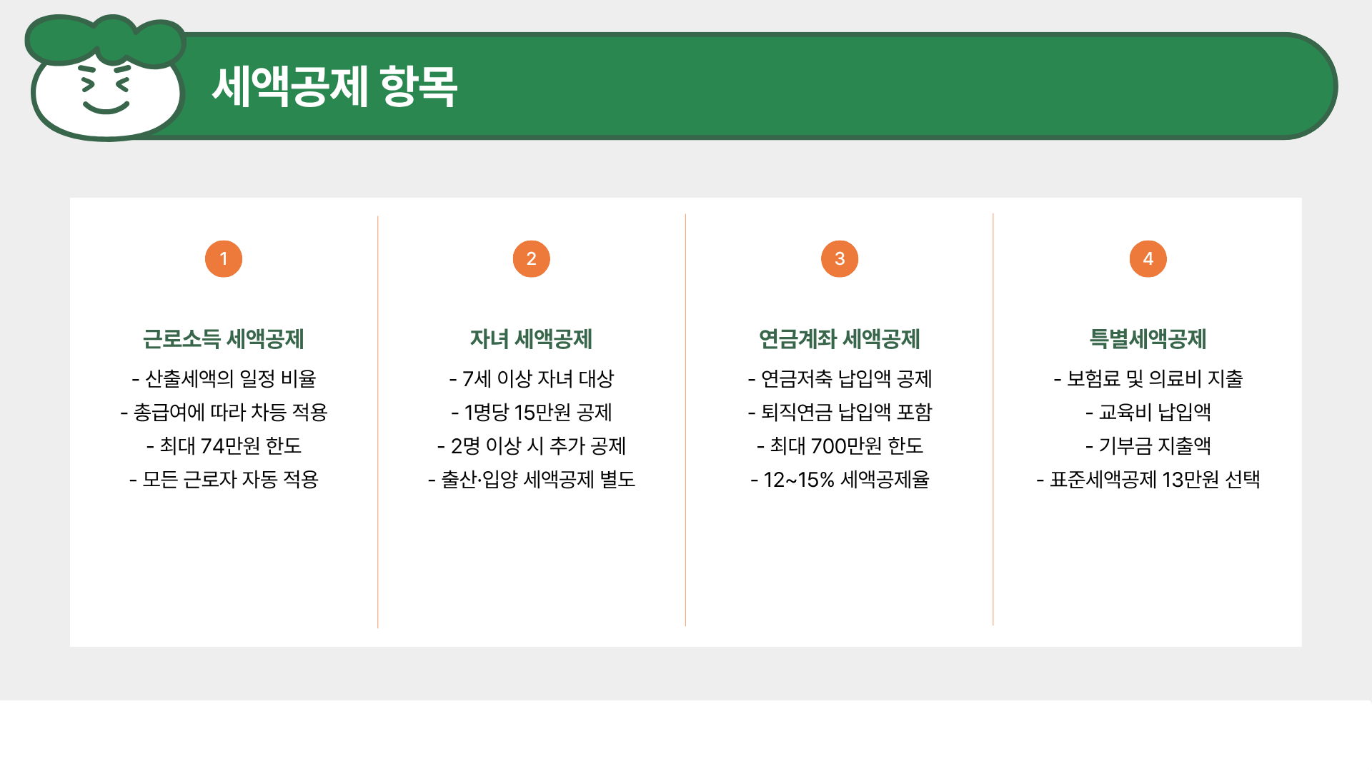 세액공제는 계산된 세금에서 직접 차감되는 방식으로 체감 효과가 매우 큽니다.