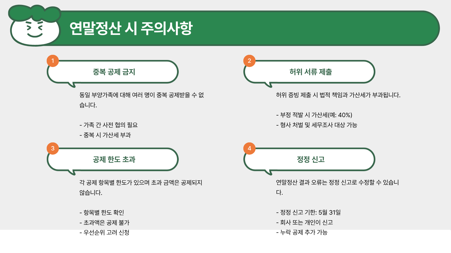 - 허위·과다 공제 시 추후 세금 추징 및 가산세가 부과될 수 있습니다.