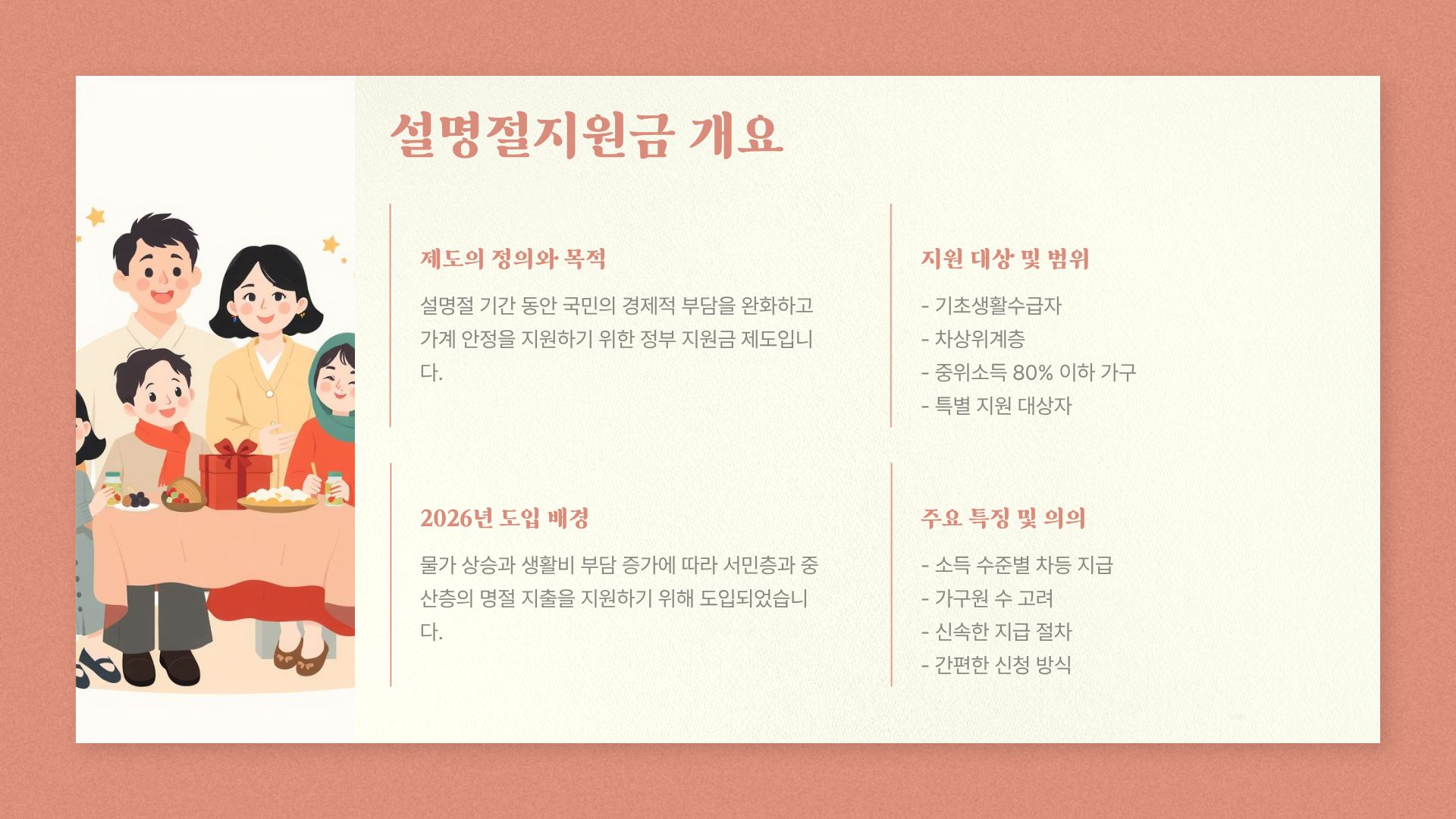 2026년 설명절 지원금은 단순한 명절 보조금이 아니라, 취약계층의 생활 안정과 정서적 지지를 위한 중요한 복지 제도입니다.