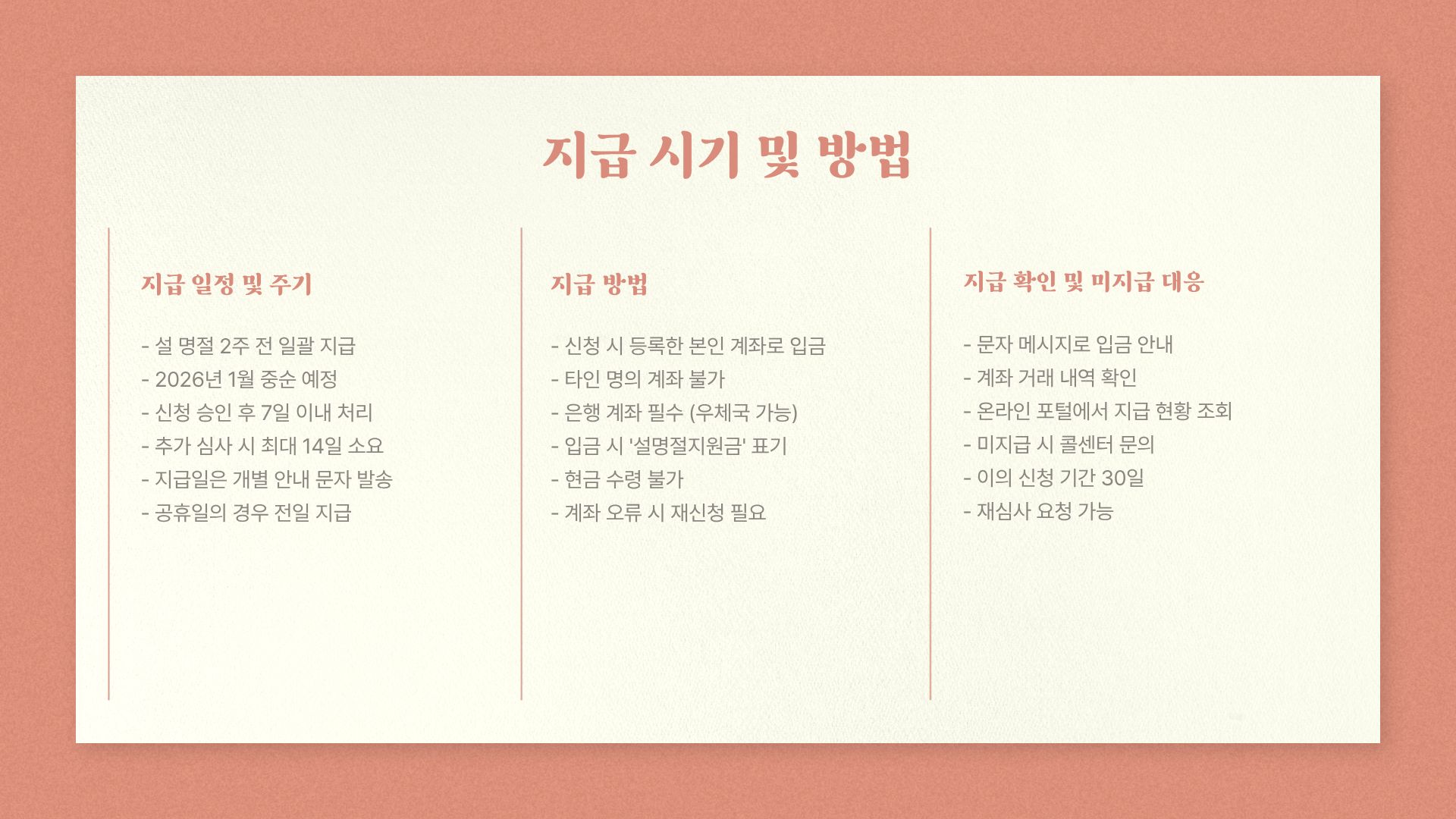 - 지급 시기: 2026년 1월 중순 ~ 설 연휴 직전