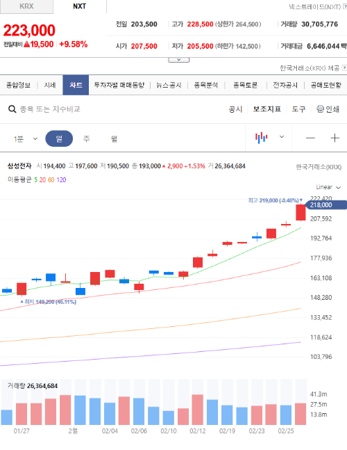 - 현재 주가: 약 ₩218,000 수준 — 전일 대비 상승 마감한 모습