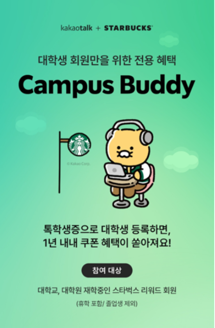 1. 캠퍼스 버디란 무엇인가대학생·대학원생 전용 무료 멤버십스타벅스 앱에서 학생 인증 후 이용대학 생활(과제, 시험, 카공)에 맞춘 혜택 제공2. 가입 대상 및 조건대상국내 대학(원) 재학생 /