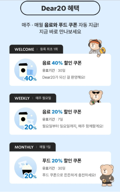 - 첫 가입 시: 음료 40% 할인 1회
