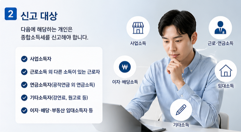 2026년 기준 종합소득세 신고기간, 대상, 신고 방법, 세율 구조, 절세 전략, 실수 방지 포인트까지 실무적으로 바로 활용 가능한 수준으로 상세히 정리해드립니다.